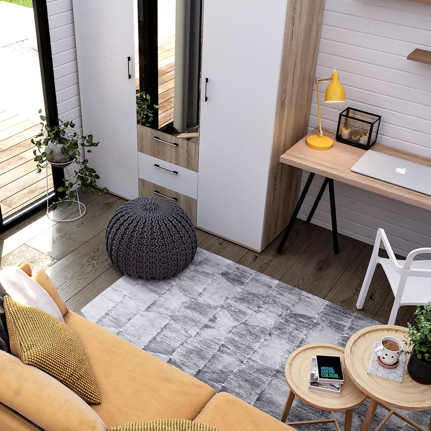 Unser Modell „Deluxe“ bietet mit 47m² großzügigen Wohn- und Essbereich sowie ein modern geschnittenes Badezimmer mit WC, Dusche und Waschbecken und ein komfortables Schlafzimmer für bis zu 2 -3 Personen. Dieses Modulhaus bietet alles was man von einem Tiny House erwartet.