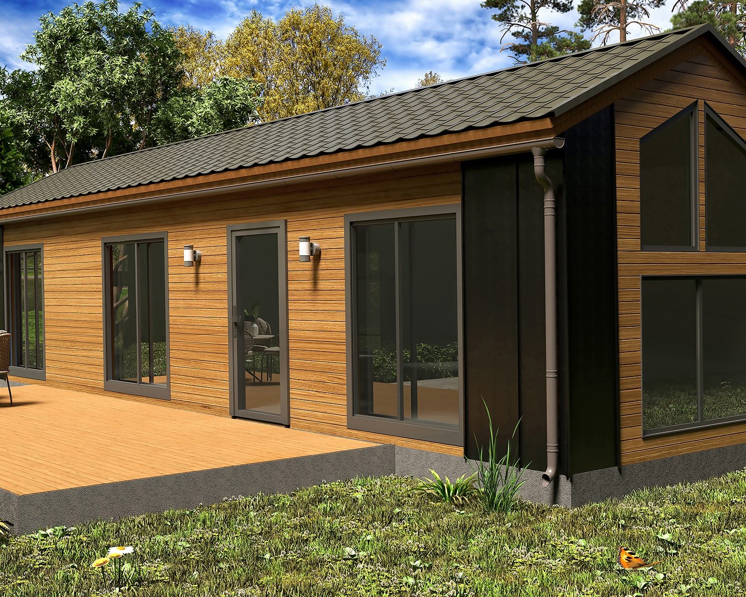 Genießen Sie die Bauweise eines hochwertigen Modulhauses mit einer Fassadenverkleidung aus hochwertigen Materialien mit einer sehr schönen Holzstruktur.